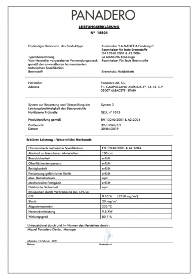 Alle unsere Panadero-Kaminöfen erfüllen die strengen europäischen Emissionsnormen. Für Deutschland sind dies z.B. die BIMSCHV Stufe II und ECO-Design 2022 sowie die regionalen Normen in Stuttgart, Regensburg und München. Im Lieferumfang sind selbstverständlich eine deutsche Bedienungsanleitung, eine Leistungserklärung des Herstellers sowie ein Typenschild enthalten.